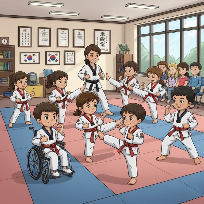 - Taekwondo: We learn how to do cool kicks and break boards! This is just in case we need to escape a bad guy (but we only use it for defense — its in the name!).